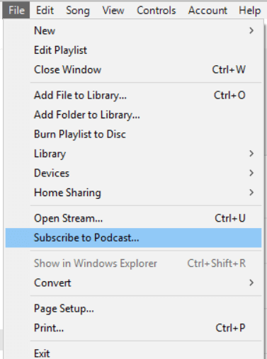 Open iTunes and click File, then Subscribe to Podcast.