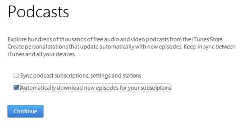 You do not need to sync, but you should select Automatically download new episodes for your subscriptions, then click Continue.